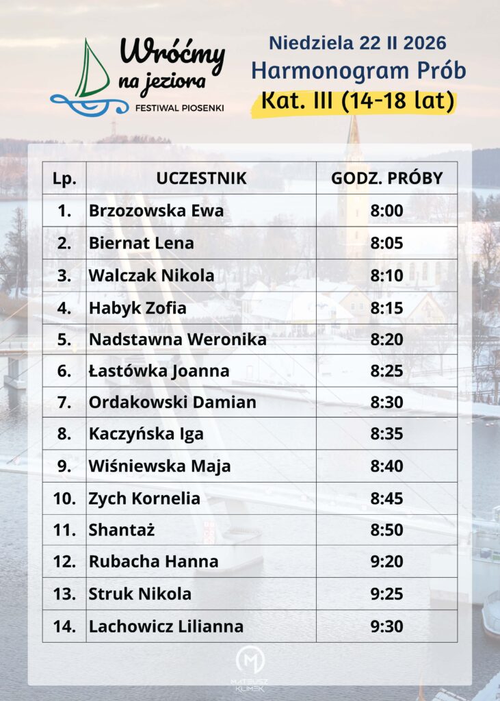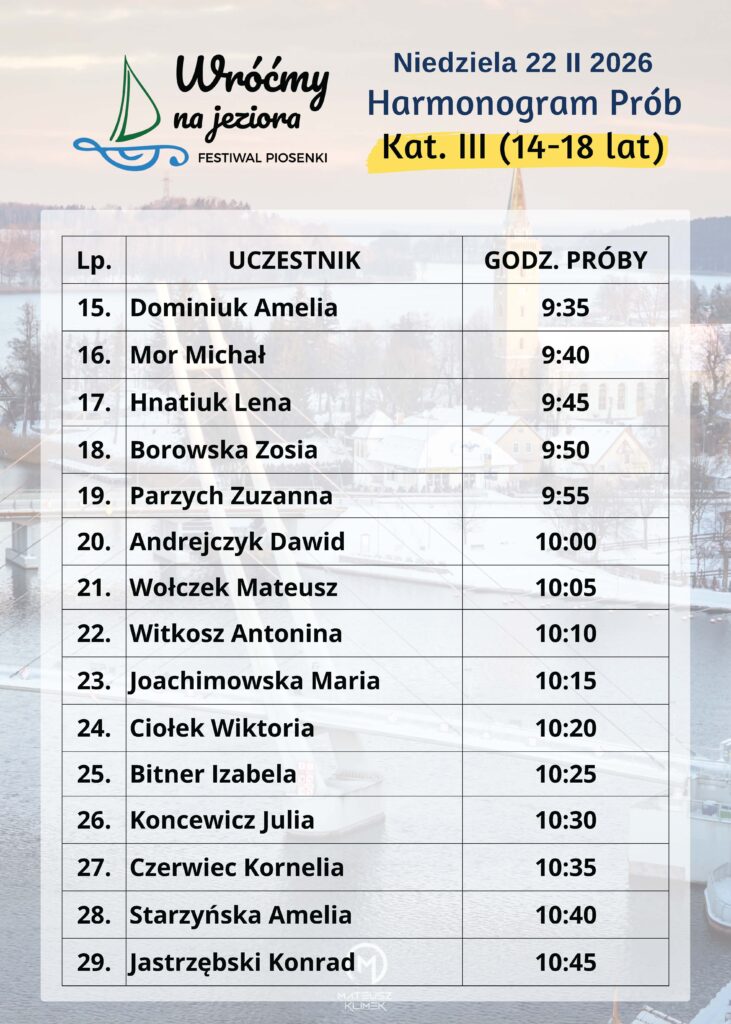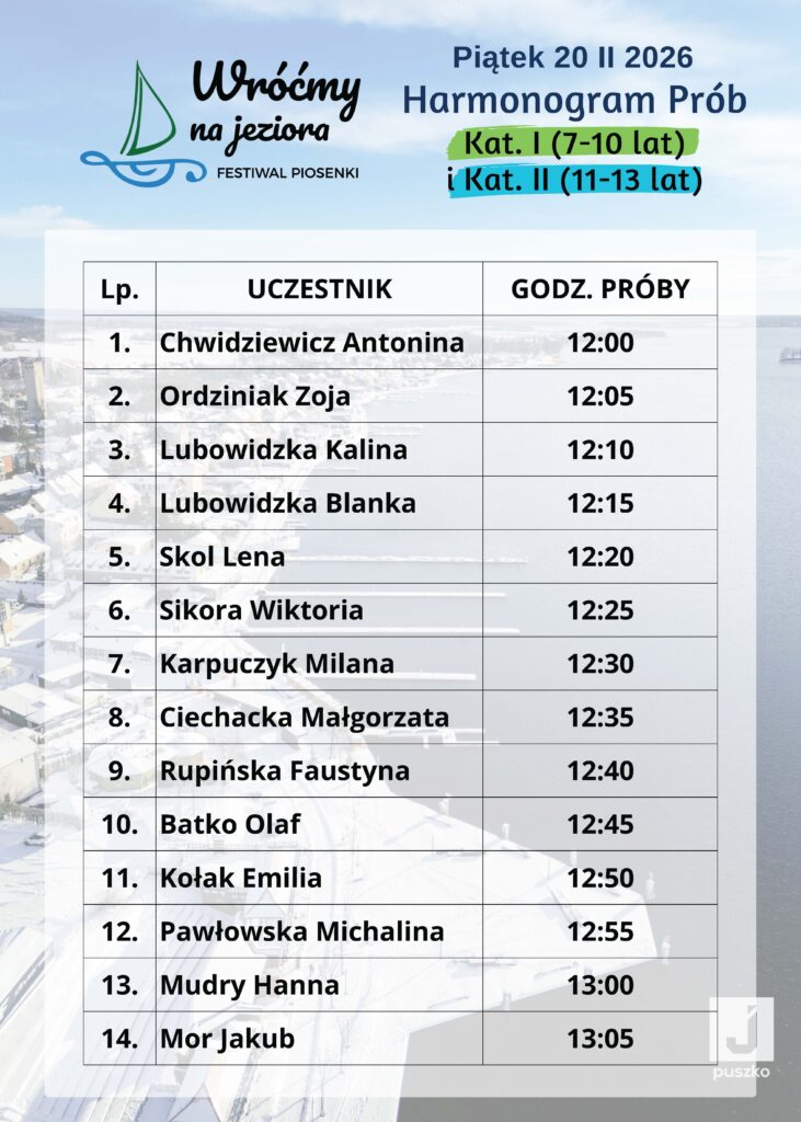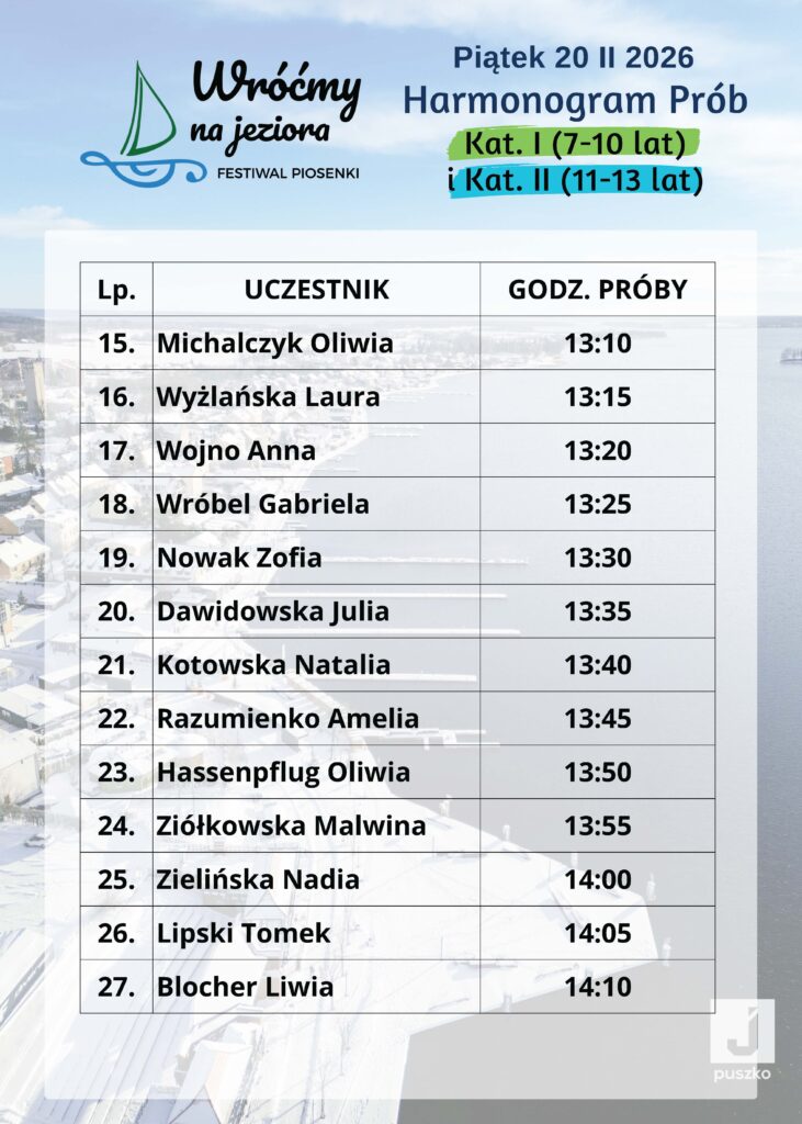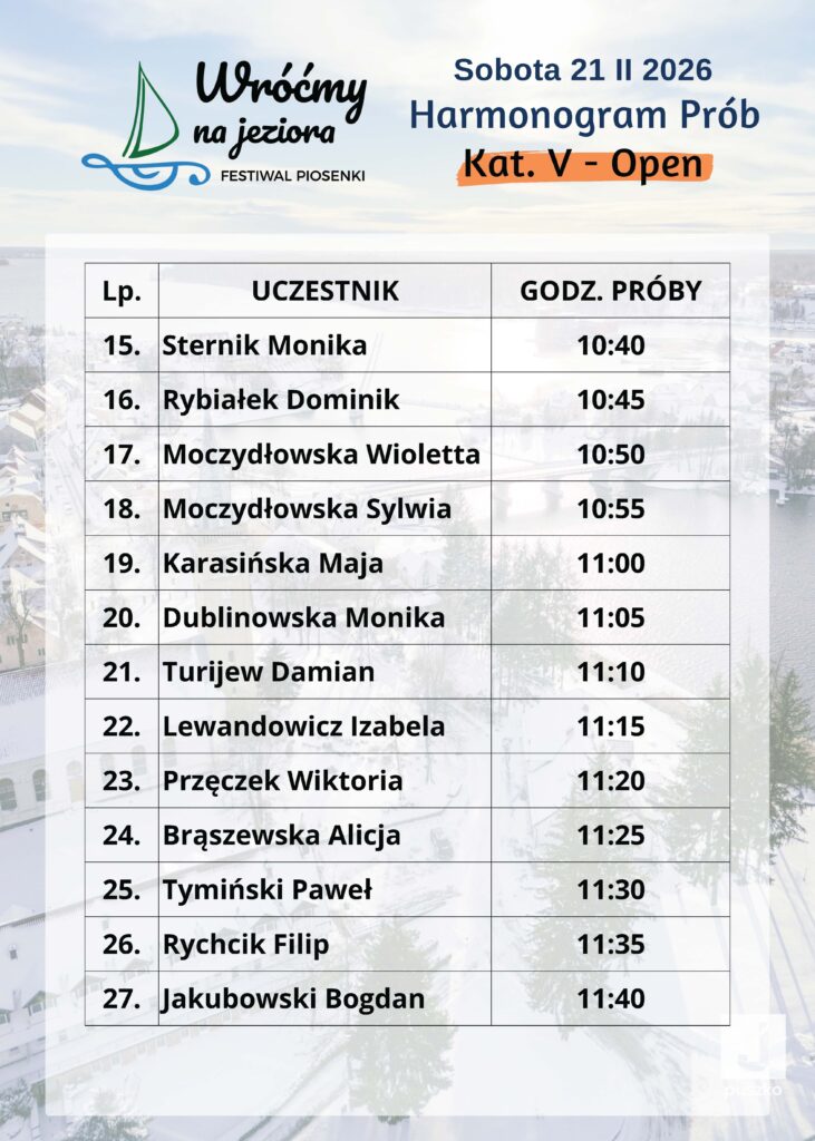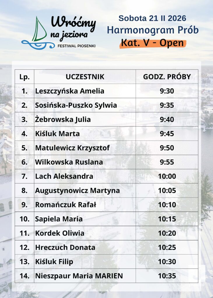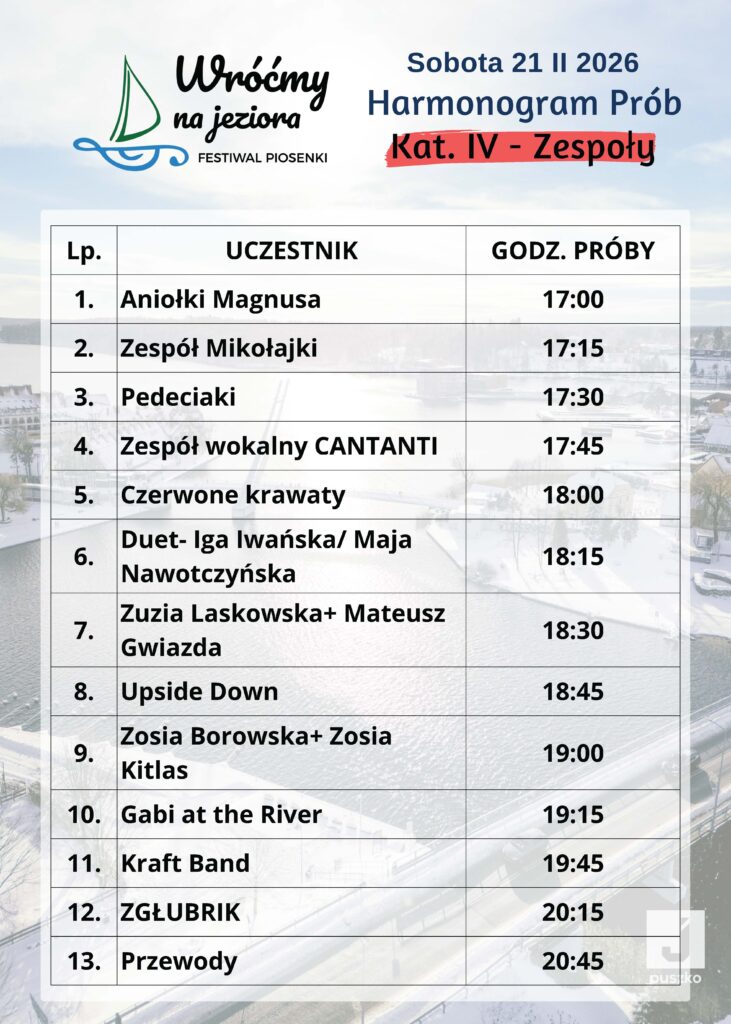 Poniżej przedstawiamy godzinowy harmonogram prób uczestników I Ogólnopolskiego Festiwalu Muzycznego „Wróćmy na Jeziora”.